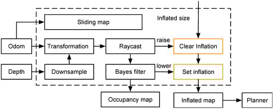 For many optimization-based motion planning algorithms, it is necessary to form virtual occupied areas. Ego-planner [12] and fast-planner [13] are batch-type inflated mapping algorithms that specify the inflated size and inflate along the triaxial direction for all objects in the update range. However, when the range of local maps increases, the time consumed by these mapping methods, especially inflated mapping, significantly increases, affecting flight efficiency and safety. Ayawli et al. [32] used the open operation in morphology to inflate obstacles and handle expansion more flexibly. The core of the expansion algorithm lies in determining the size of the safety margin. When the MAV wheelbase is larger, the margin of safety for inflating accordingly increases. At the same time, a more significant margin of safety can reduce the requirements for depth measurement accuracy and control precision. When the expansion size and local update range are small, the additional computational volume introduced by inflation can be negligible. However, the batch-style inflation algorithm is significantly more time-consuming in the face of MAVs with larger wheelbases, which require more extensive updated ranges and inflated sizes. In addition, the ego-planner requires the initial allocation of map size and cannot be adjusted in real-time, limiting the flight range.