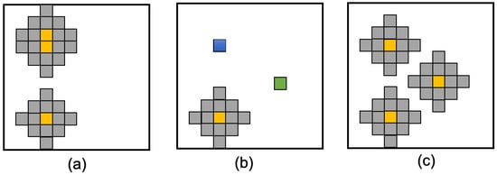 The inflated map expands the objects by a specific size to form a virtual area, which the center of MAV mass should not reach [12]. The proposed algorithm focuses on the voxels with an occupancy status that has continuously changed due to the odometry changes. These voxels are changed because of the movement of the MAV or the noise of sensor measurements. The designed lower and raise arrays are used to record the indexes of voxels, the occupancy status of which has changed from free to occupied and from occupied to free, respectively. Then, the batch BFS algorithm is used to process lower and raise. An example of the method in 2-dimensional space is given in Figure 3.