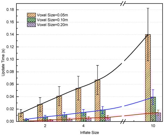 In this section, the time performance is tested with different map resolutions and inflated sizes on the laboratory corridor dataset. The map resolution is usually determined by the size of MAVs and is set at 0.05 m, 0.1 m, and 0.2 m in the tests. To evaluate the effectiveness of the algorithm, the inflated size is set to 1 to 10 times the map resolution, which is recommended to be once or twice in practice. When the inflated size is too large, one can appropriately increase the map resolution. In the mapping, the sliding map size is set as 100 m 100 m 6 m, the local update range as 16 m 16 m 6 m, and the number of neighbors to 6. The update time for inflating is shown in Figure 6. According to the experimental results, the proposed algorithm is efficient at smaller inflated sizes and large resolutions. The update time sharply increases as the resolution decreases. However, the update time slowly increases at smaller inflated sizes due to the small size of lower and higher.
