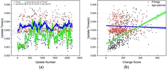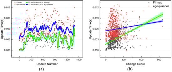 Comparison of the laboratory corridor dataset. The resolution is 0.2 m and the inflated size is double voxel resolution. The update number axis means the time axis. (a) The time consumption with update number. (b) The time consumption with change score.