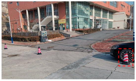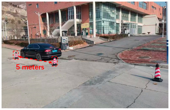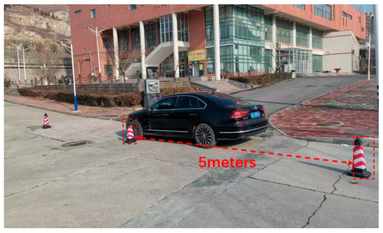 Based on the time synchronization principle mentioned above, a flat road surface was selected for the time synchronization verification test of the multi-source sensor. A certain brand of car was used as the vehicle for the verification test. We placed three triangular cones in a straight line every 5 m along the road direction. The three triangular cones were numbered successively, and the first triangular cone was placed at the center of the left front wheel of the car, taking the center point as the starting point, as shown in Figure 2. We started the car and drove at a constant speed. The constant speed of the car was 40 km/h. Through the driver’s operation on the vehicle, the vehicle entered the fixed speed cruise mode, to ensure that the vehicle traveled at a uniform speed. The car passed the second and third triangular cones in turn. When the center of the front wheel of the vehicle overlapped with the second and third triangular cones (as shown in Figure 3 and Figure 4), the point cloud data at each triangular cone was obtained by LiDAR, as shown in Figure 5. According to Formula (5), the coordinates (, , ) of each point cloud center were be obtained, and then the distance () between the point cloud center of any triangular cone and the point cloud center at the starting point were calculated according to Formula (6).
