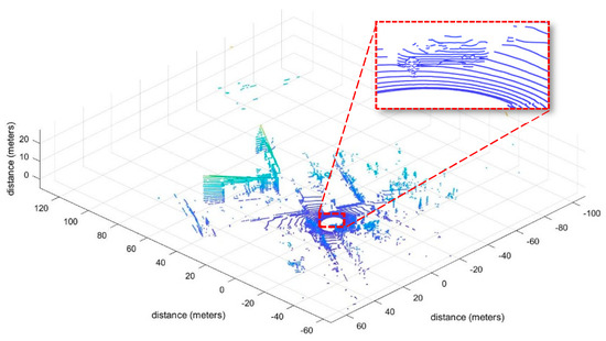 The next frame image is numbered as the , where all square brackets in this section indicate that they integers. When , the point cloud of frame and the image of frame form a set of point pairs. represents the difference between the time used by the frame image and the time used by the corresponding frame LiDAR data. If the difference is less than the set threshold, the image data of this frame can be retained; otherwise, they will be eliminated. When , the point cloud of frame and the image of frame form a set of point pairs. represents the difference between the time used by the frame image and the time used by the corresponding frame LiDAR data. If the difference is less than the set threshold, the image data of this frame can be retained; otherwise, they will be eliminated. The remaining image information that does not satisfy the above two inequalities is eliminated. Eventually, the LiDAR and camera data are combined into new packets. The time synchronization of the information collected by the two sensors is realized through the operation process.