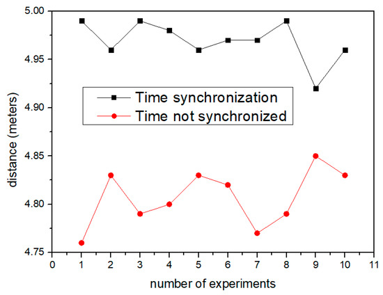 The results are shown in Figure 6 and Figure 7. Figure 6 shows the position deviation when the vehicle moved 5 m, while Figure 7 shows the comparison of position deviation when the vehicle moved 10 m. As can be seen from the two figures, the data deviation after sensor realizes time synchronization is less than that without time synchronization. After time synchronization, the accuracy of moving 5 m and 10 m can reach 99.86 percent and 99.49 percent, respectively.