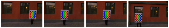 Based on the above two theoretical methods, the road of the author’s campus was selected as the test site. During the experiment, corner points inside the calibration board were identified according to the position changes of the calibration board, as shown in Figure 8. Finally, the point cloud was effectively projected onto the calibration board. The black point cloud part represents the background point where the LiDAR scans the surrounding environment, and the red point represents the point cloud scanned onto the calibration board. During the moving process of the calibration board, the inclination and azimuth of the calibration board at different times were be recorded, as shown in Figure 9.
