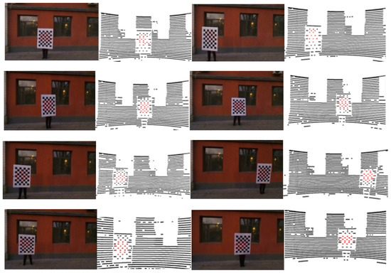 where represents the 3D point cloud coordinates of LiDAR. stands for the rotation matrix . stands for the translation matrix . represents the camera’s internal parameter. represents distance depth information. represents the pixel coordinate points of the actual projection. Among them, the parameters that need to be optimized are and . In the optimization process, nonlinear function optimization is introduced to minimize the reprojection error and obtain more accurate values of and . Based on time synchronization between camera and LiDAR data, parameters were optimized by using the recursive optimization method (LM) improved by the gradient descent method and the Gauss–Newton method. The main advantage of an LM algorithm is to ensure fast convergence while ensuring decline. Since the position of the camera and LiDAR relative to the calibration plate is unknown, the camera and LiDAR, under different attitudes, are calibrated by moving the calibration plate in the process of space synchronization, so a least-squares problem is constructed using the inclination angle and azimuth angle of the camera and LiDAR relative to the calibration plate as the error source. Therefore, the global loss function between LiDAR and camera can be defined as:
