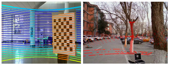 After finding the optimal plane, calibration optimization is needed, and the main purpose of optimization is to reduce the reprojection error in the 3D–2D point pair projection process. Finally, the space synchronization of LiDAR and camera is realized. The process of projecting the 3D point cloud onto the image is as follows: