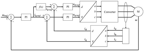 The reference value for iq is calculated based on the torque or speed required by the application, either by the accelerator pedal or cruise control, respectively. Then, in order to achieve MTPA, id is calculated according to the following expression [18,19]:
