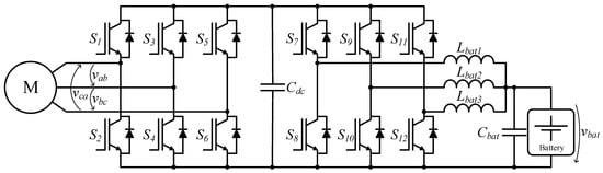 The traction system that acts an interface between the batteries and the SRPM machine consists of an ac-dc and dc-dc converters sharing a dc-link, the ac-dc being a three-phase three-leg bidirectional converter with six insulated-gate bipolar transistors (IGBTs), and the dc-dc being a three-phase interleaved bidirectional buck-boost converter with six IGBTs, which means that both converters were similar in design, as can be seen in Figure 2.