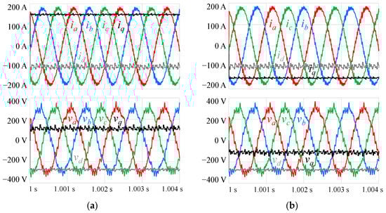 Simulation results of the stator windings voltages (va, vb, vc, vd, vq) and currents (ia, ib, ic, id, iq), applying Park’s transform with the electric machine operating as a generator at nominal speed (12 krpm), coupled with a −50 Nm load, rotating in the directions conventionalized as (a) positive and (b) negative.