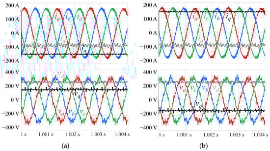 Figure 4 presents the simulation results obtained for the SRPM machine at nominal speed, coupled with a load of 50 Nm, showing the applied voltages and currents in the stator windings in both the abc and dq coordinate systems. More specifically, in Figure 4a, the electric machine is rotating in the positive direction, which can be confirmed by the sequence of phases being abc. In the case of Figure 4b, the sequence of phases becomes acb, representing a negative direction of rotation, resulting in inverted values for both iq and vq, as expected, validating Park’s transform.