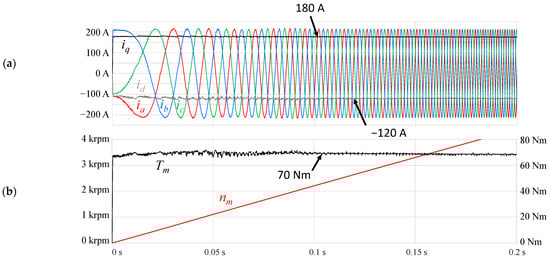 In Figure 6, a more dynamic result can be observed, this being the acceleration of the SRPM machine from a stopped position, having a reference speed of 12 krpm. In this simulation, iq was limited to 180 A, allowing for a maximum torque (Tm) of roughly 70 Nm, which was higher than that of the SRPM machine implemented in the prototype because the simulation model of the machine did not account for magnetic saturation. The stator windings’ currents can be seen in both the abc and dq coordinate systems, allowing for the visualization of the increase in frequency with the increase in speed.
