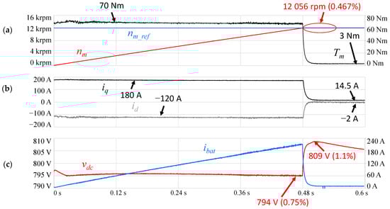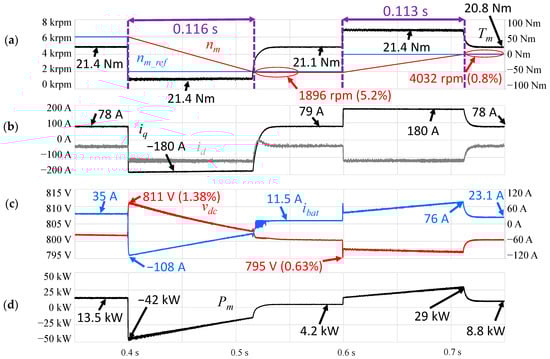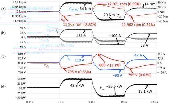 Figure 8 presents four different load states observed when keeping the reference speed constant at its nominal value of 12 krpm. At start-up there was no load, as can be inferred from the low values of current, torque and power. Then, at 0.4 s the load was increased to 30 Nm, resulting in an increase in current and, subsequently, torque, as well as undershoots in speed and vdc of 0.32% and 0.63%, respectively. The resulting torque in the cruise state was around 34 Nm and the power was around 42.9 kW. At 0.45 s, the load decreased to −30 Nm, resulting in a change in the operation mode from a motor to a generator, with an inversion in current and torque. This change caused overshoots in speed and vdc of 0.59% and 1.1%, respectively. The resulting torque in the cruise state was around −29 Nm and the power was around −36.6 kW. Even when the value of the load was symmetrical, the losses in electrical and mechanical systems translated into lower torque and power values when operating as a generator in comparison to operating as a motor. Finally, at 0.5 s the load was increased to 10 Nm, inverting the operation mode from a generator to a motor. The behavior is similar to the observations at 0.4 s, where slight undershoots in terms of speed and vdc of 0.32% and 0.63%, respectively, were observed. The resulting torque in the cruise state was around 14 Nm and the power was around 18.1 kW.
