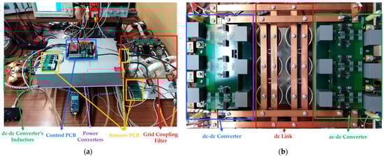 In Figure 11, the traction prototype can be seen in more detail. More specifically, Figure 11a depicts the control printed circuit board (PCB) that housed the TMS320F28379D microcontroller from Texas Instruments, along with the signal conditioning and protection mechanisms and the AD2S1205 resolver-to-digital converter with its respective circuits. Furthermore, on top of the aluminium case that covered the power converters, was a PCB sensor that integrated Si8920BC-IP isolated amplifiers from Silicon Labs for measuring currents and voltages, either coupled with shunt resistors or voltage dividers, respectively. On the left are the dc-dc converter’s inductors, which were made in-house with Micrometals OE-520026-2 iron powder cores, and which had an inductance value of 140 μH at 250 A. In Figure 11b, it is possible to observe what lies below the aluminium case, with two structurally similar converters sharing a dc link, the left one being the dc-dc converter and the one on the right being the ac-dc converter. The dc link had three types of capacitors, six 420 µF B25620B1427A101 capacitors from TDK, twelve 25 µF C4AQQBW5250A3OJ capacitors from KEMET and, lastly, twelve 22 nF A72SQ2220AA00J capacitors, also from KEMET, all in parallel, resulting in a total capacitance of 2820 µF. Each switch of the power converter topology was implemented with four IKW40N120H3 IGBTs from Infineon Technologies in parallel, and for the respective antiparallel diodes, four SiC-based Schottky C4D08120E diodes were used due to their positive temperature coefficients. To protect the semiconductors, transient voltage suppressors were implemented, using two 1.5KE600A devices from Littelfuse in series in order to withstand 1024 V, which is higher than the nominal dc-link voltage but lower than the 1200 V maximum allowed by the semiconductors. As for gate drivers, Infineon Technologies model 1EDI60N12AF systems were used per switch, in other words, per set of four parallel IGBTs. To cool the power converter’s semiconductors, a water-cooling system was implemented through the use of two 416601U00000G cold plates from Aavid, with one per converter.