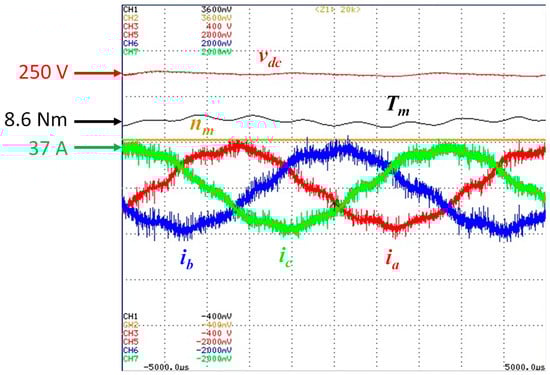 Experimental results of the traction system operating at a constant speed (6000 rpm) without a load: the torque (Tm) and speed (nm) of the SRPM machine; dc-link voltage (vdc); stator windings’ currents (ia, ib, ic).