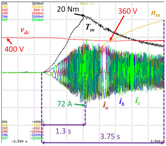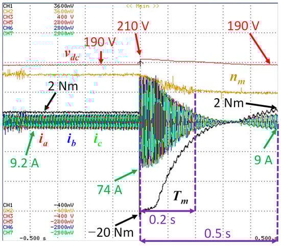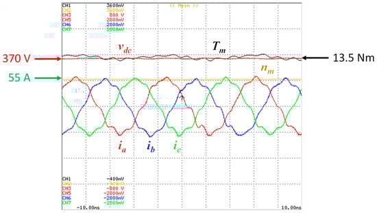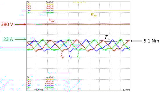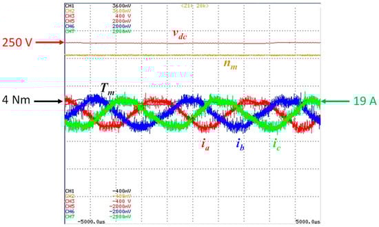 Experimental results of the traction system operating at a constant speed (4000 rpm) without a load: the torque (Tm) and speed (nm) of the SRPM machine; dc-link voltage (vdc); stator windings’ currents (ia, ib, ic).