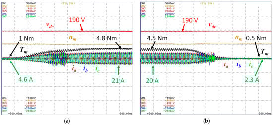 Experimental results of the traction system operating at 1000 rpm: the torque (Tm) and speed (nm) of the SRPM machine; dc-link voltage (vdc); and stator windings’ currents (ia, ib, ic) when varying the load from (a) 0 Nm to 4 Nm and (b) 4 Nm to 0 Nm.
