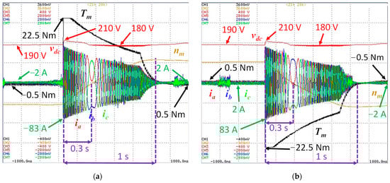 Experimental results of the traction system: the torque (Tm) and speed (nm) of the SRPM machine, dc-link voltage (vdc) and stator windings’ currents (ia, ib, ic) when inverting the rotation direction without a load: (a) −1000 rpm to 1000 rpm; (b) 1000 rpm to −1000 rpm.