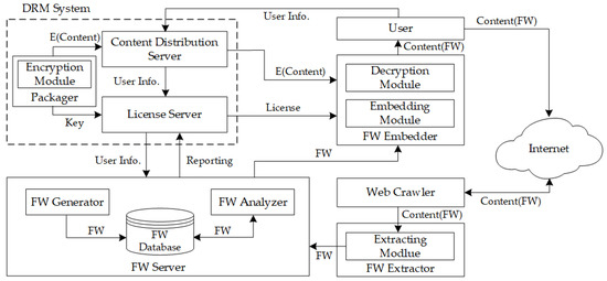 The forensic watermark (FW) inserts a forensic watermark containing copyright information into the embedded content when the user normally purchases the original content of the copyright holder. First, before the user purchases the content, the content must be encrypted to prevent copyright infringement and the illegal copying of content. To this end, a DRM system that manages the rights of digital content is utilized. In the DRM system, the encryption module uses the encryption key to encrypt the content of the copyright holder, transmits the encrypted content to the content distribution server, and transmits the encryption key used for encryption to the license server [12].