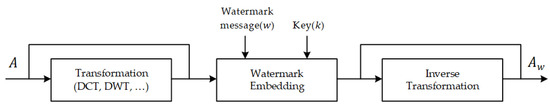 Figure 2 below shows the watermark embedding process of the general frequency domain approach. A means original content for embedding a watermark and w means a watermark. The watermark embedding module encrypts the watermark message (w) using the key value (k) and inserts it into A. denotes the content in which a watermark is inserted through the frequency domain approach.