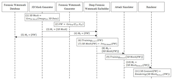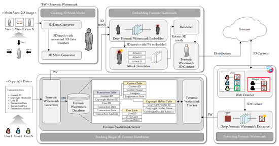 In this section, we propose a DNN-based forensic watermark tracking system to prevent the illegal distribution of 3D content created based on artificial intelligence. The system utilizes DNN technology to construct a forensic watermark insertion and extraction process and prevent watermarks from being altered by artificial intelligence algorithms. It also adds a layer of attack between the forensic watermark insertion process to ensure that the forensic watermark is robust against both malicious and non-malicious distortion. Therefore, even if 3D contents with forensic watermarks are unintentionally modified while being used by ordinary users or by malicious users on intentionally attack pirated copies, the unmodified forensic watermarks are extracted from the 3D contents. Forensic watermarks are used to track piracy and distributors of 3D content. To this end, during the forensic watermark insertion process, the forensic watermark is inserted to include transaction details (e.g., buyer, purchase details, purchase price, etc.) for each content ID. Afterward, a strong uncensored watermark is extracted from the 3D content that is illegally reported or monitored and, based on the content ID, the user transaction history is retrieved to track the users who have copied or distributed the content illegally. This system is designed with the coming metaverse environment in mind and is a tracking model for determining and protecting from copyright infringement of 3D content. The system was inspired by the 3D-to-2D watermarking technology proposed by I. Yoo. the components of their thesis were referred to [8] and the overall structure of the proposed system is shown in Figure 4. The proposed system consists of a total of 11 modules and the functions of each module are shown in Table 1 below.