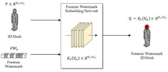For forensic watermark embedding of the system proposed in this paper, the deep forensic watermark embedder utilizes I. Yoo’s encoder [8] to embed messages into the vertex components of the 3D mesh. In the deep forensic watermark embedder, the secret message, which is a forensic watermark, is replicated times and tensors are constructed according to the dimension of the vertex. Here, means the number of vertices in the 3D mesh and means the binary message inserted as a forensic watermark. A 3D mesh is expressed as and the vertices are expressed as . refers to factors such as 3D positions, normal, and vertex colors. We define by concatenating the vertices with the tensor composed of a watermarked vertex. is obtained by configuring , which is a vertex message embedding neural network. In the proposed system, Equation (1) below can be expressed through and . Figure 6 below shows the DNN-based forensic watermark embedding architecture.