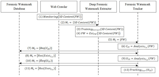Illegal 3D content can be flagged by others or monitored by web crawlers that monitor 3D content on the Internet. When illegal 3D content distribution is detected in the 3D content randomly fetched by the web crawler, the system’s process of tracking the distributor is initiated. If the illegal 3D content is detected through monitoring, the detected illegal 3D content is transmitted to the forensic watermark extractor. The forensic watermark extractor extracts the forensic watermark and transfers it to the forensic watermark tracker. Next, the forensic watermark tracker tracks the illegal 3D content based on the extracted forensic watermark. Figure 8 below shows the process of tracking illegal 3D content based on forensic watermarking.