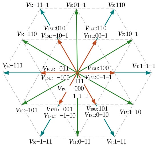 The switching states of the NPC inverter are defined as 1, 0, and −1, corresponding to three output levels of Vdc/2, 0, and −Vdc/2 for each phase, so there are 33 = 27 switching states for the three phases, corresponding to 27 basic vectors in the space vector plane. As shown in Figure 2, the basic vector can be divided into large vectors V1~V6, medium vectors V7~V12, small vectors V13U~V18U and V13L~V18L, and zero vector V19.