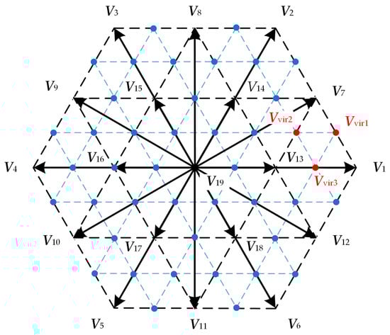 On the basis of Figure 4, the existing adjacent voltage vectors operating Ts/2 are chosen in order to enhance the performance of FCS-MPC, and additional virtual space vectors are added to extend the control set. By repeating the above steps, the intersections in the vector diagram will become more intensive, and the number of virtual vectors per extension can be described as follows: