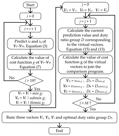 - In the process shown in Figure 6, MPCC is used to determine the basic three vectors needed to synthesize the optimal vector. Subsequently, the duty ratio and prediction value corresponding to the synthesized virtual vector are calculated and added to the optimization search, and the optimal three vectors are continuously updated to achieve triangle area reduction and fast duty ratio calculation.