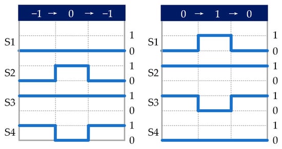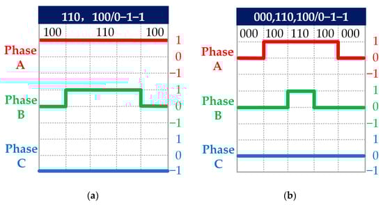 As shown in Figure 8a, when the optimal vector is synthesized of two vectors: 110 and 100/0−1−1, if the small vector is 100, then the switching principle of this paper is satisfied and the output vector can be sorted directly. If the small vector is 0−1−1, the control of neutral point voltage should be abandoned in this control period, and the small vector should be replaced by 100 before the output vector sorting. Similarly, the three-vector sorting method is shown in Figure 8b. When the basic vector direct sorting does not meet the switching principle of this paper, any small vector still needs to be replaced with the corresponding redundant small vector.