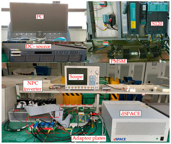 To verify the performance of the ECS-MPCC strategy proposed in this paper, the experimental system for the permanent magnet synchronous motor fed by NPC three-level inverter was established. The experimental system uses the rapid control prototyping (RCP) module DS1007 from dSPACE® (Paderborn, Germany) as the controller, the Infineon® I-Type three-level module F3L100R07W2-E3_B11 (Infineon Technologies, Neubiberg, Germany) in parallel to form an inverter, and the load feed and sudden change using SIEMENS® S120 frequency convertor (Munich, Germany) driving load motors as dynamometers. The parameters of the PMSM are shown in Table 2, and the experimental system is shown in Figure 10.
