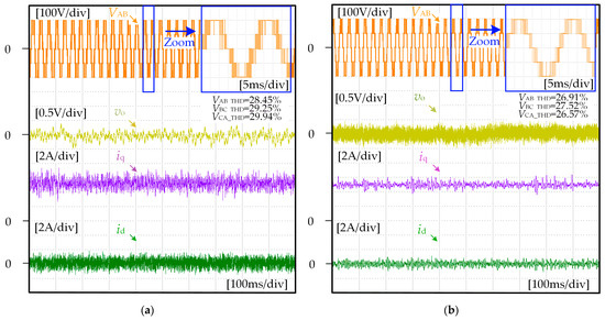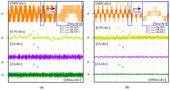 In order to verify the steady-state performance of the strategy, the control period of the proposed ECS-MPCC strategy is further given to be 290 μs, and the traditional MPCC control period is given to be 100 μs. The control effects of the two strategies on the output voltage VAB, d-q axis current id and iq, and neutral point voltage vo are compared at the same switching frequency. Figure 11 and Figure 12 illustrate the experimental results under different operation conditions.