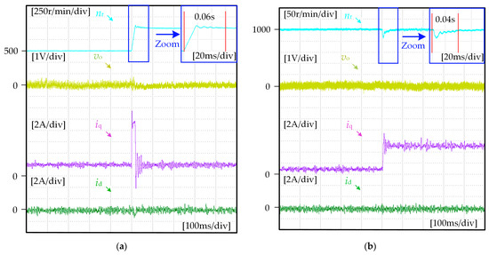 As shown in Figure 13a, when the reference speed is stepped from 500 r/min to 1000 r/min, the iq of the motor will increase rapidly to achieve rapid tracking of the target speed. After the dynamic process, the iq is reduced to the original value. During the whole process, the motor reaches the target speed within about 0.06 s, and the overshoot is small. As shown in Figure 13b, when the motor encounters a sudden change in load torque during operation, the speed of the motor decreases, and the error with the reference speed increases, resulting in an increase in iq, ensuring that the motor can return to a given speed. During the whole dynamic process, the motor only has a small speed fluctuation, and can recover to the given speed within 0.04 s. After the dynamic process, the iq of the motor increases with the increase of the load torque. In the transient process, due to the sudden increase of current, the fluctuation of vo will increase, but still less than 1 V, indicating that the proposed ECS-MPC strategy can effectively control the neutral voltage fluctuation of NPC inverter. From the above analysis, the transient experimental results show that the FCS-MPC strategy has good dynamic control performance.