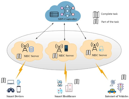 However, SDN-based MEC offload schemes still face some challenges in the IoT. Due to the variability of human activities and the suddenness of requests, the MEC system suffers from a sharp increase in computational load and instability []. Therefore, optimizing the decision scheme for computation offloading is a critical issue. In traditional computation offloading strategies, most of the offloading strategies focus on binary offloading strategies [,], which means that computational tasks are either executed completely locally on the user devices (UDs) or completely offloaded to the MEC server for execution. However, there are many computational tasks that need to be partitioned into multiple partitions and computed on various devices, for example, when using camera surveillance, deep neural networks are needed to handle video surveillance with real-time, supporting hybrid computational offloading of streaming data are more beneficial for training and inference of deep neural networks []. While hybrid computational offloading strategies are suitable for such computational tasks, most of the latest techniques focus only on latency or energy consumption and ignore the computational and network load balancing of the whole system [,], which does not guarantee the full utilization of network and computational resources in the system. Moreover, even though a few papers consider load balancing, most of them can only perform binary offloading and not dynamic offloading at arbitrary ratios, which severely bounds the offloading decision [].