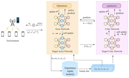 The DDPG framework mainly consists of four deep neural networks, which are the actor network, whose network parameters are denoted as , the actor target network, whose network parameters are denoted as , the critic network, whose network parameters are denoted as , and the critic target network, whose network parameters are denoted as , where the critic network and the actor network are in the same network structure as the corresponding target network.