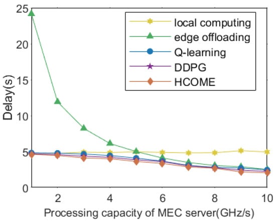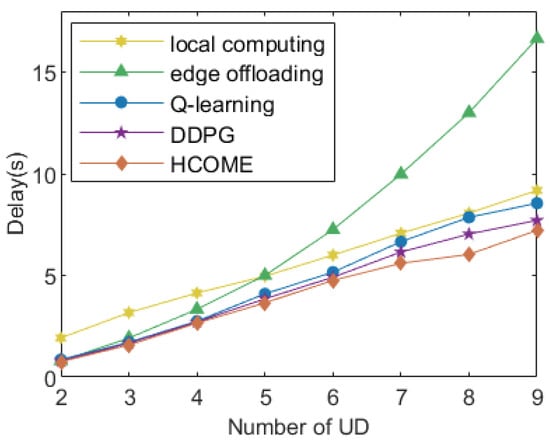 As shown in Figure 4, we investigate how the processing ability of the MEC server affects the total system latency. The horizontal coordinate in the figure is the processing capacity of different MEC servers, and the vertical coordinate is the total system latency. At this time, the number of UDs is , and the number of cycles required for the tasks of UDs is uniformly distributed between 900 M and 1100 M. It can be seen from the figure that the total system latency gradually decreases for all schemes except the local computing scheme as the processing power of the MEC server increases. This is because the fully local computation scheme only needs to use UD’s local computing resources instead of putting the tasks on the MEC server for processing, so the latency of the approach using fully local computing is essentially constant and stable. In addition, we can observe that the edge offloading scheme has high latency when the processing power of MEC server does not exceed . This is because when the processing power of MEC server is low and there are more tasks offloaded to MEC server, which makes MEC server has insufficient computing power to meet the computation demand of tasks, so the latency of processing tasks is larger. Since the Q-learning algorithm scheme uses discrete offloading, it uses the MEC server for processing tasks while also using local execution of some of the tasks. As a result, as the processing power of the MEC server increases, the edge offloading scheme, the Q-learning algorithm scheme and the DDPG scheme gradually approach HCOME but are always higher than HCOME. Thus, our algorithm outperforms other algorithms.