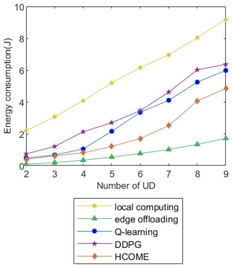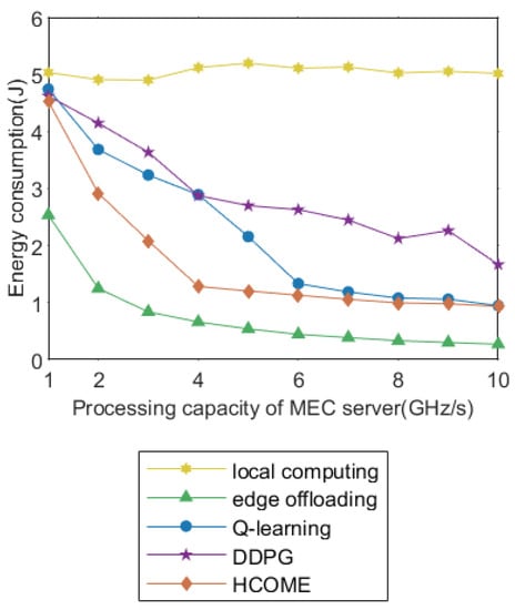 Second, we also analyzed the impact of the number of UDs and the processing capacity of the MEC server on the total system energy consumption. As shown in Figure 5, we investigated the effect of the number of UDs on the total system energy consumption. The horizontal coordinate in the figure is the number of UDs and the vertical coordinate is the total system energy consumption. At this time, the computational capacity of the MEC server is , and the number of cycles required for the tasks of UD is uniformly distributed between 900 M and 1100 M. From the figure, we can see that the total system energy consumption of all five schemes gradually increases as the number of UDs increases. The DDPG scheme, which considers only the latency performance, results in its excessive energy consumption, which is not conducive to the utilization of resources. On the other hand, the edge offloading scheme consumes the least amount of energy because the edge offloading scheme executes the tasks of UDs completely on the MEC server and without using the computational resources on the UDs. Compared to executing on UD, the energy consumption of executing tasks on MEC server is lower due to the larger computational power of MEC server. Moreover, we can observe that HCOME is the best execution scheme except the edge offloading scheme, mainly because HCOME allows better and customized task allocation, which makes the energy consumption lower.