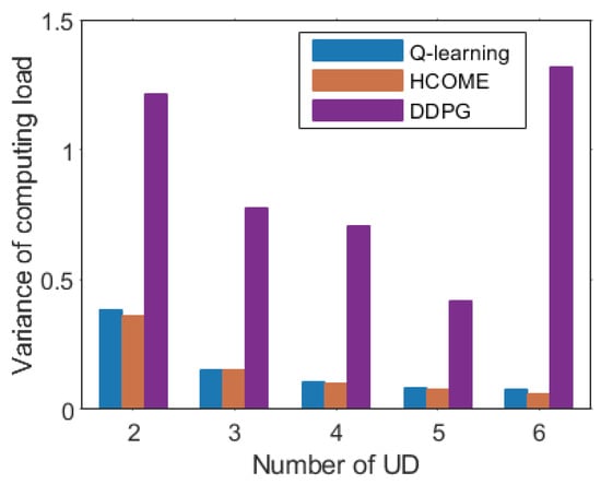 Secondly, as shown in Figure 7, we find that as the number increases, the demand for computational resources from the tasks becomes more complex. Since each UD generates a task that needs to be processed, the number of tasks that need to be processed will increase as the number of UDs increases, resulting in a lower computational load variance that can be obtained by HCOME and tends to be stable, which means that when HCOME makes decisions, it can make balanced use of network resources and prevent network congestion caused by too many UDs. On the contrary, it can be seen from the figure that the DDPG scheme has a higher computational load and no clear trend of fluctuation and has a poor performance in balancing the computational load.