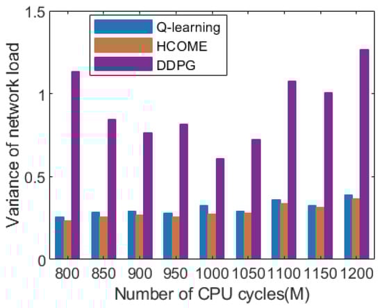 The effect of the number of CPU cycles required for the task on the network load variance is given in Figure 9. As the number of CPU cycles required for a task increases, the network load variance fluctuates slightly, but generally tends to increase. It can be seen from the figure that the network load variance of HCOME is more stable when the number of CPU cycles is between 900 M and 1050 M, which means that HCOME is very practical and more advantageous when the number of CPU cycles for the task is not too large.