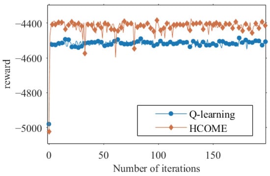 As shown in Figure 10, we also conducted experiments to verify the convergence of our proposed algorithm. Since only the delay problem is considered in [] and different factors are considered when setting the reward, only HCOME and Q-learning are compared when verifying the convergence of our proposed algorithm. The horizontal coordinate is the number of iterations and the vertical coordinate is the reward value. At this point, the number of UDs is , the computational capacity of the MEC server is , and the number of cycles required for the tasks of UDs is uniformly distributed between 300 kbit and 500 kbit. We define the reward as inversely proportional to the total system overhead and load. That is, the larger the reward value, the lower the total system overhead and the more balanced the load of the MEC system, indicating the better performance of the algorithm. It can be seen from the figure that the reward values of both Q-learning algorithm scheme and HCOME increase as the number of iterations increases, and the reward value of HCOME is larger than that of Q-learning algorithm scheme, which has better optimization effect. However, the convergence speed of HCOME is slower than that of the Q-learning algorithm scheme.