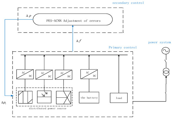 Microgrid are mini-grids composed of distributed power sources, loads, and energy storage devices [1]. As an important model for future smart grids, they have received extensive attention from scholars at home and abroad [2,3,4]. At present, the control architecture of a microgrid is mainly divided into centralized and distributed; centralized controllers are usually affected by network communication, etc., which leads to the failure of generation fluctuation, while distributed control strategy is an ideal structure; each distributed power controller is independent and equal to ensure the stability of the system and ensure the information sharing of each distributed power [5,6,7,8], so it is widely used in the microgrid. However, the flexibility of microgrid and the droop control method used by distributed power supplies cause the frequency and voltage of the system to deviate from the rated value [9,10], In Ref. [11] for the AC-DC microgrid, a distributed compensation dynamic feedback method is proposed to improve the accuracy by droop gain and total load current used in the distributed compensation strategy. However, the traditional control methods are usually limited by the fuzzy microgrid itself parameters, and the instability of renewable energy sources, loads, and other factors in the microgrid has an enormous impact, so regulating the output power of the distributed power supply by designing a secondary frequency controller to control the frequency of the system becomes a vital issue.
