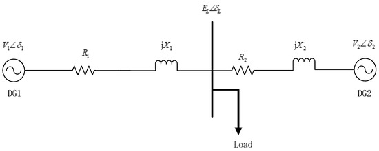 Where is the voltage (i = 1, 2…) of the inverter output of the distributed power supply, (), is the common side AC bus voltage; and are the resistance and inductance; the line impedance line is denoted as . The resulting expressions for the active and reactive power of the inverter are as follows: