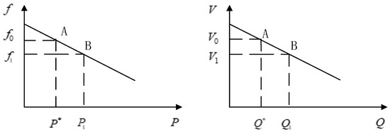 The rated frequency of the system at point A during stable operation corresponds to the active power of the system as and the output voltage in the V-Q curve reach the reactive power of . When the load in the microgrid system increases, the operating point of the system moves from A to B. The design remains stable when the frequency and voltage decrease and the active power and reactive power increase; thus, droop control is used to achieve the power balance of the microgrid system.