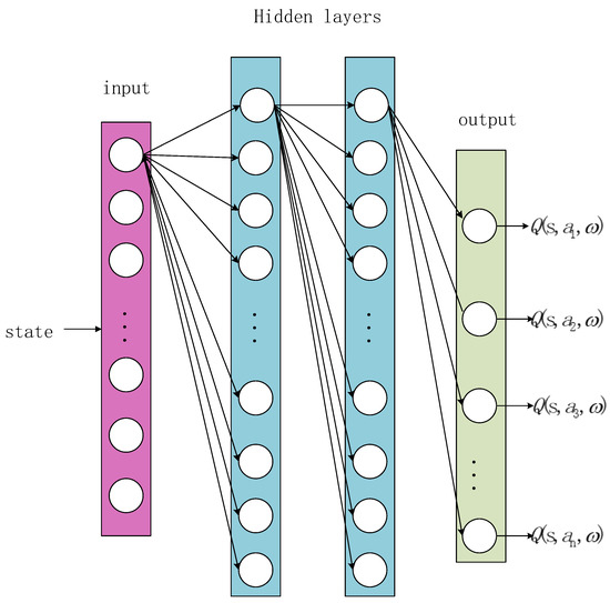 Since the state and action of the Q function in the reinforcement learning algorithm have a high-dimensional complexity, to solve this problem, a neural network Q(s, a; ω) can be introduced as a function approximator to estimate the Q(s, a) function, denoted as a deep Q network DQN and compared to Q-Learning, which approximates the input function of the state and action of the Q function as the Q of the action obtained after the analysis of the neural network values and selects the maximum Q value as the following action, as shown in Figure 5.