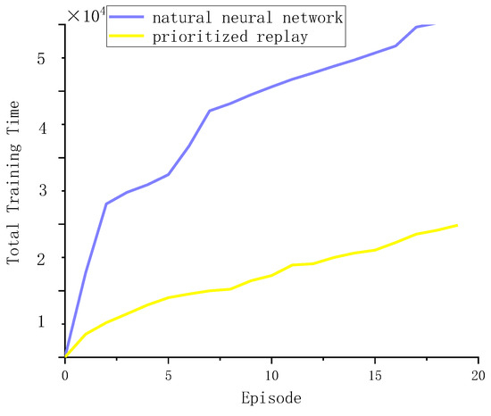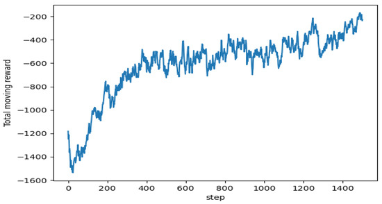 The training results of the traditional control method combined with the PES-AC neural network algorithm for the multi-agent system are shown in Figure 10. It can be seen from the figure that as the training proceeds, the reward experience obtained by the neural network rises continuously, and the reward obtained by the algorithm can be stabilized in the corresponding interval at about 1000 rounds of training; adding priority experience replay can make the neural network preferentially use the experience pool with higher reward experience during training, reduce the training fluctuation, and accelerate the convergence speed to achieve satisfactory results, as shown in Figure 11.