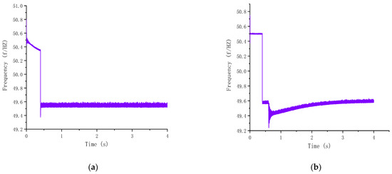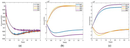 The experiments in this section are conducted to verify the effectiveness of the role of the proposed secondary frequency control. The simulation of the conventional control method is performed in the constructed microgrid model, and the simulation results of the proposed secondary regulation control in this paper are compared with the same parameters throughout the simulation. At the initial moment, the microgrid test system works the load of each node is matched with the nominal frequency of the generation unit.