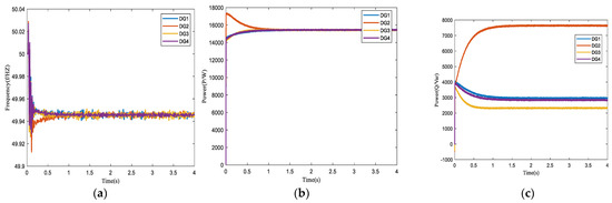 The microgrid system can achieve proportional active power distribution under decentralized primary control with droop control, but the frequency of the system decreases below the rated frequency and finally stabilizes as shown in Figure 12.