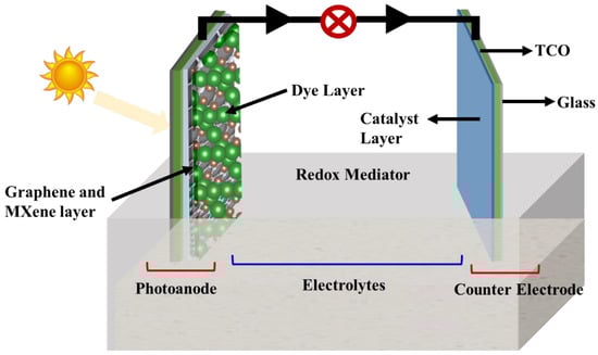 A schematic illustration of a PEDOT-MXene-based DSSC. The images have been reproduced with permission [112].