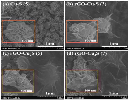 SEM images of (a) Cu2S and (b–d) rGO-Cu2S. The images have been reproduced with permission [86].