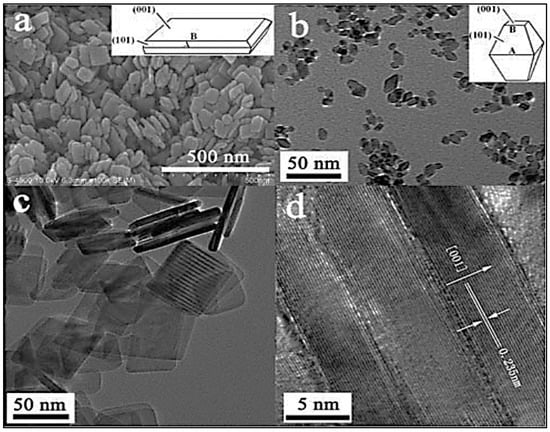 (a) SEM, (b,c) TEM, and (d) HR-TEM images of TiO2-NS. The images have been reproduced with permission [93].